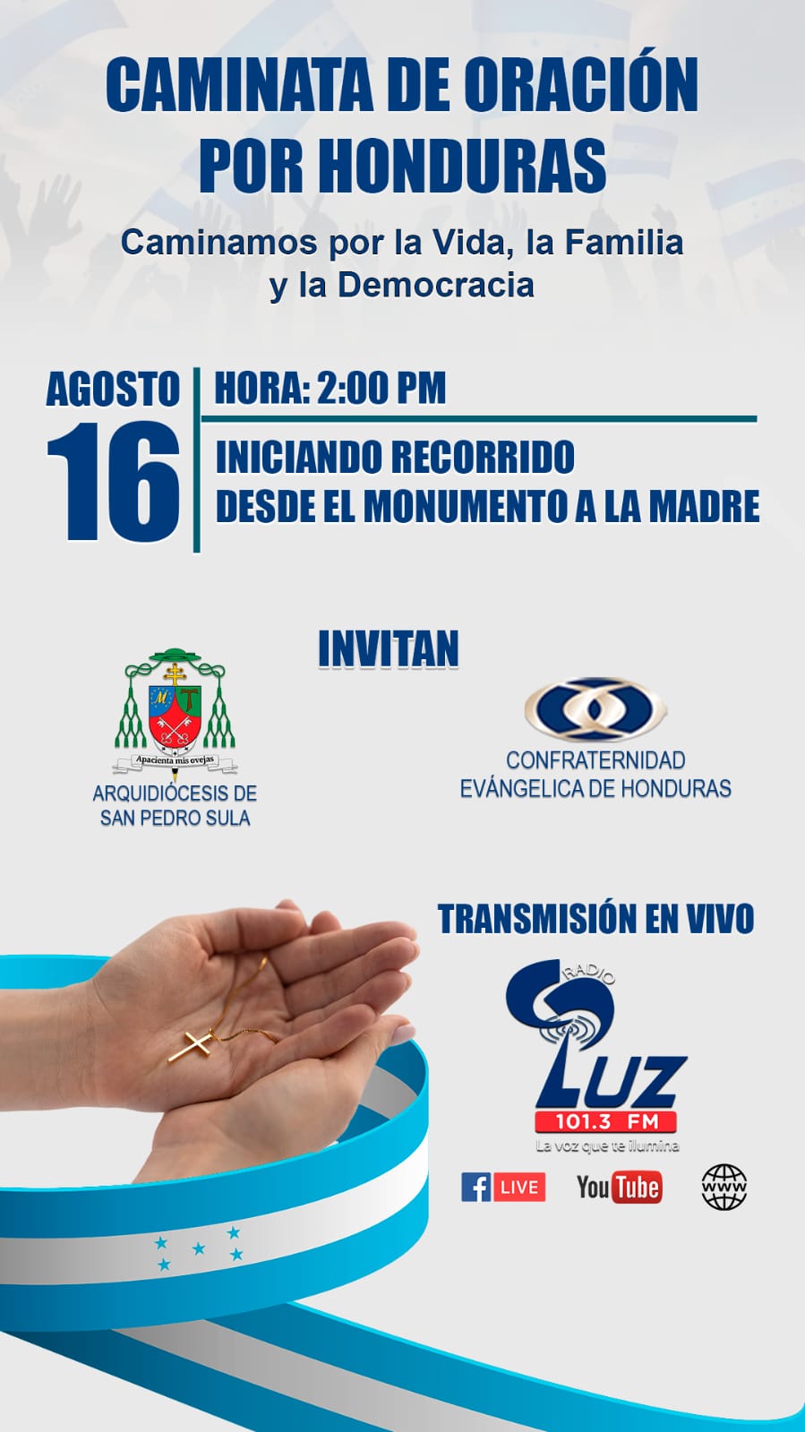 La Arquidiócesis de San Pedro Sula y la Confraternidad Evangélica de la zona norte invitan a la caminata de “Oración por Honduras” que ha sido convocada por la Conferencia Episcopal de Honduras (CEH) en conjunto con la Confraternidad Evangélica hondureña. La caminata