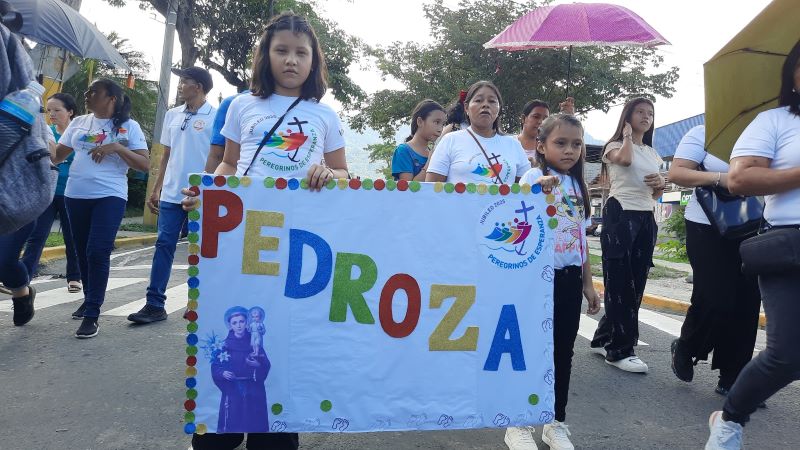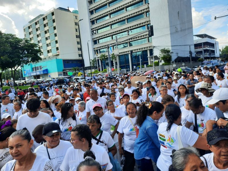 Los fieles caminaron luciendo camisas blancas con el logo del jubileo 2025, salieron desde Plaza las Banderas, encabezando la peregrinación la cruz y la imagen de la Virgen María.