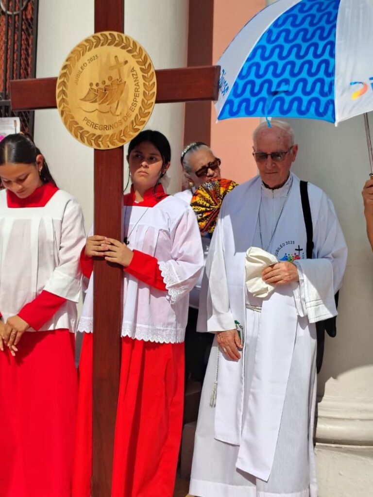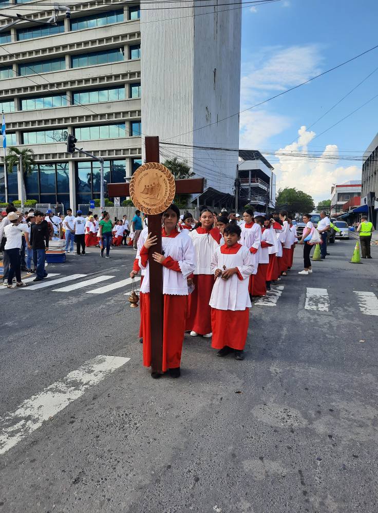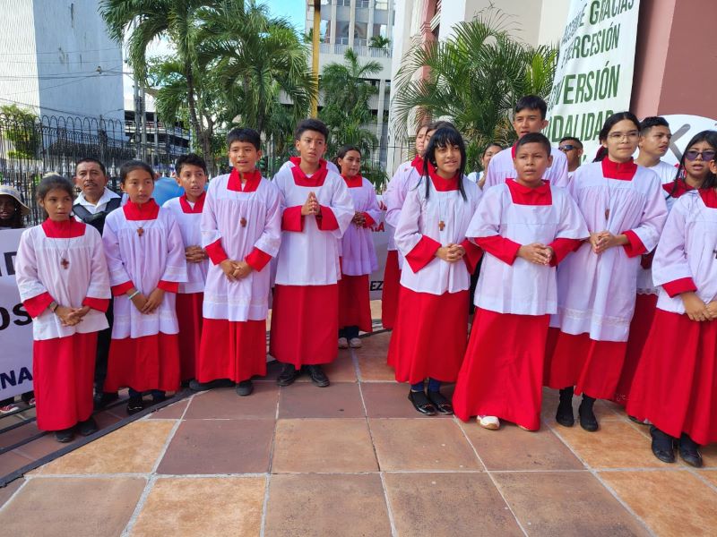 Al llegar a las puertas de la catedral y con el sonar de las campanas dándoles la bienvenida, los peregrinos fueron recibidos por el secretario canciller de la Arquidiócesis de San Pedro Sula, el padre Gustavo Fuentes quien en nombre del arzobispo Miguel Lenihan les dijo: “los recibo con alegría y agradecimiento y los acojo en esta catedral que es la Iglesia de todos los fieles de la Arquidiócesis, les doy gracias por el esfuerzo para recorrer el camino que los trae hasta aquí, pero sobre todo les agradezco el camino espiritual que han recorrido, camino de conversión, comunión, renovación misionera y de caridad fraterna, los invito a entrar por esta puerta de la esperanza siguiendo mis pasos y reunirnos en asamblea litúrgica para celebrar los divinos misterios”.