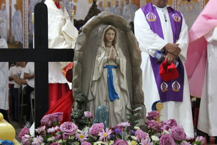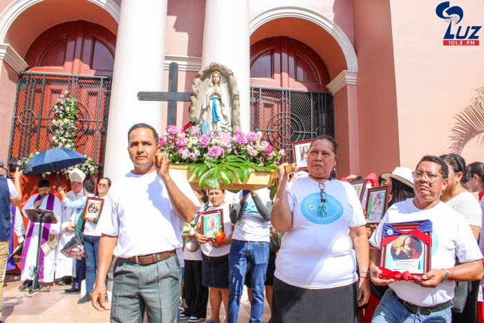 Peregrinos de todas las comunidades de la parroquia llegaron en una caravana de 32 buses, se congregaron para caminar llevando la Cruz del Perdón, la imagen de la Virgen de Lourdes y el santo patrón de cada comunidad.