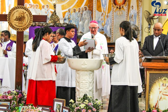 Seguidamente, haciendo memoria de nuestro bautismo y de nuestro compromiso de vivir como bautizados, Monseñor Miguel bendijo el agua para el rito de aspersión.