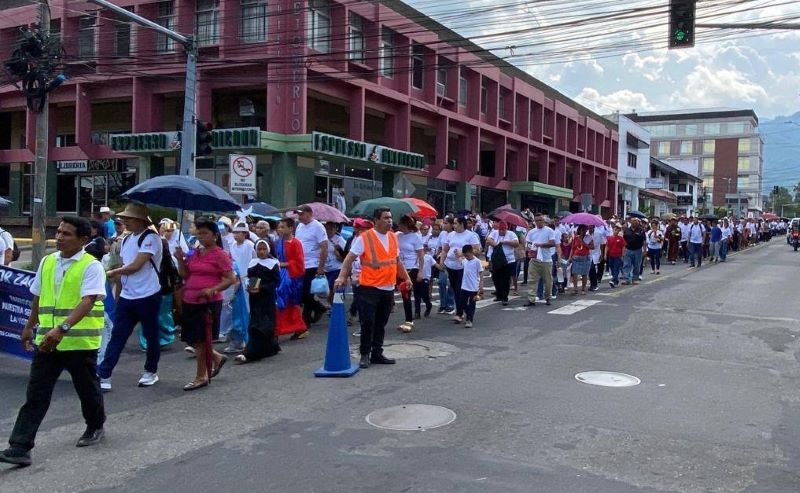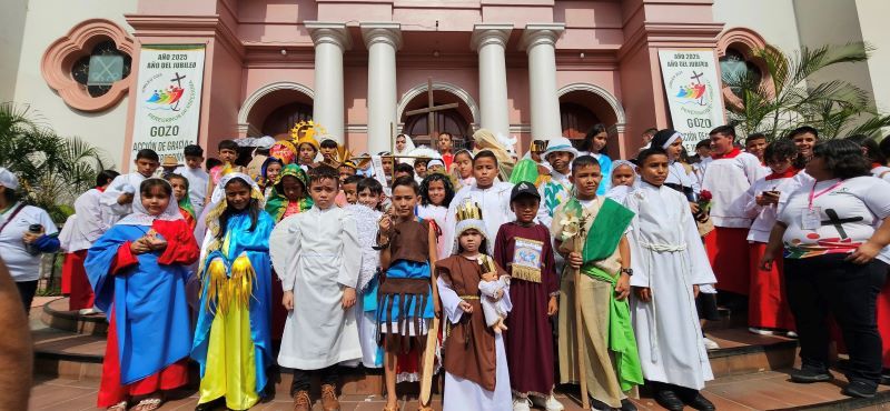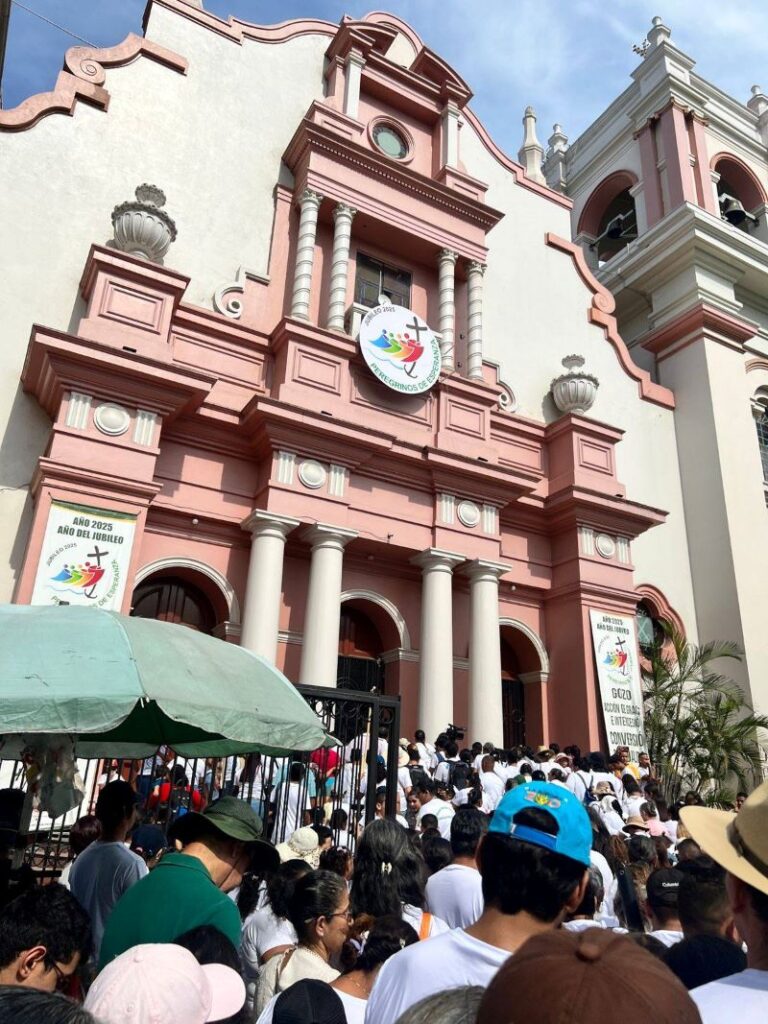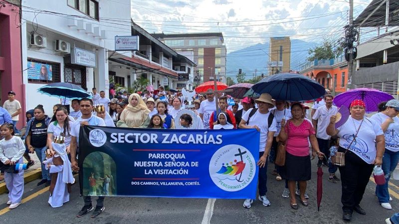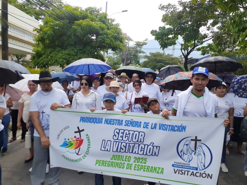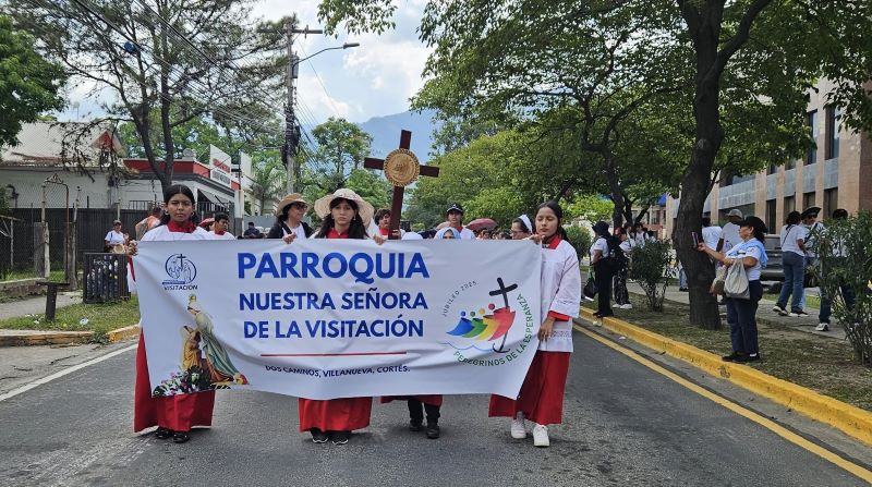 La parroquia Nuestra Señora de la Visitación de Dos Caminos, Villanueva, Cortés, realizó su peregrinación jubilar el domingo 17 de agosto, los fieles de todas las comunidades parroquiales se congregaron en la Plaza las Banderas para caminar hacia catedral acompañados de su párroco Natael Perdomo, el vicario, padre Marvin Guerra, el seminarista Eduardo Fernández y otros seminaristas menores que son frutos vocacionales de esta parroquia.