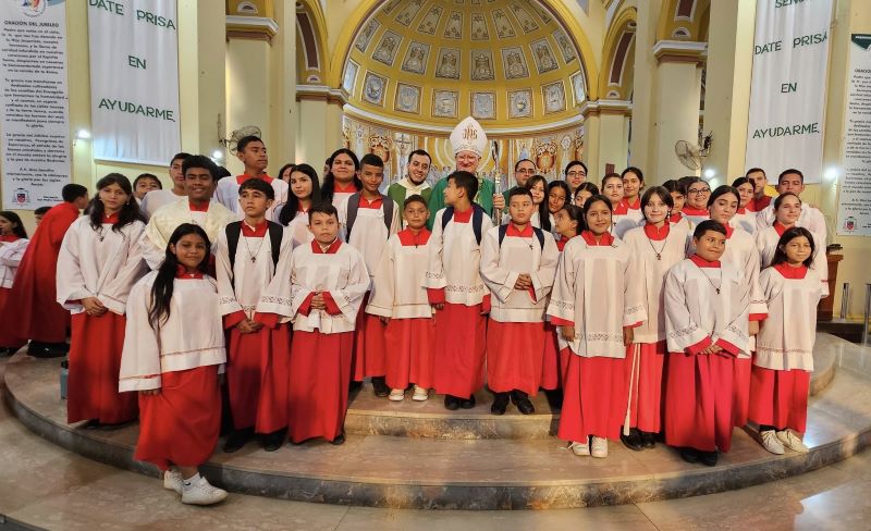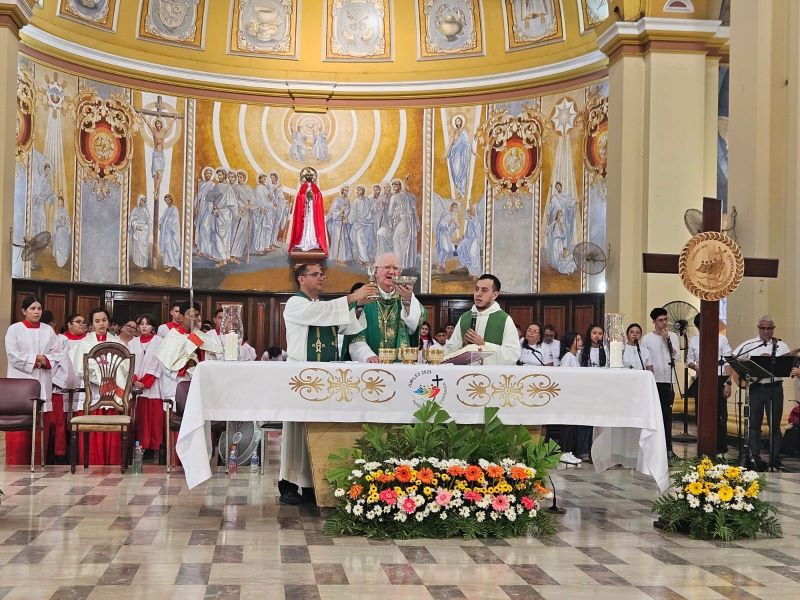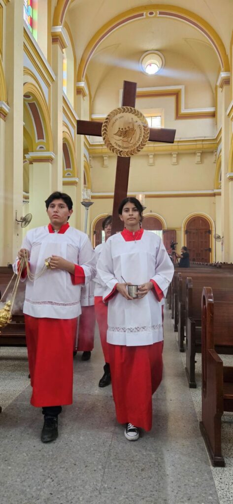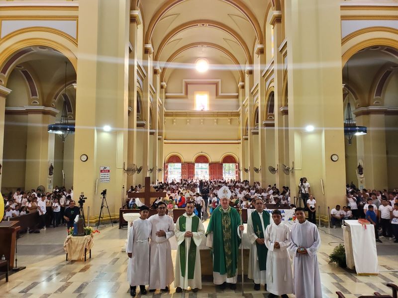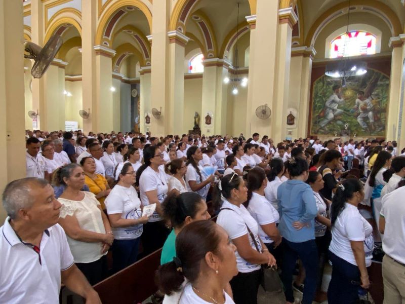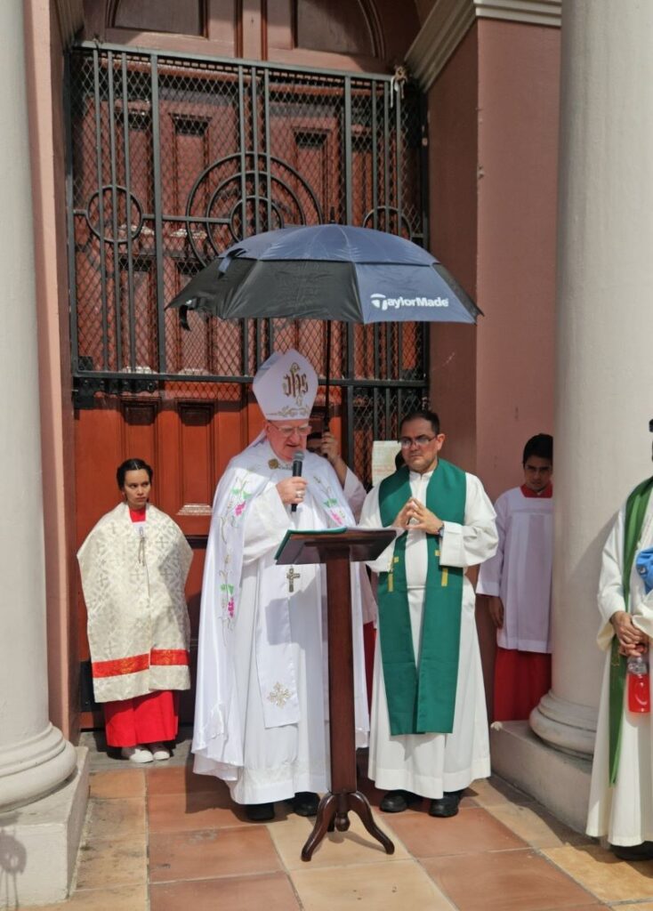 El sonar de las campanas anunciaba la llegada de los peregrinos. En el atrio de la catedral, Monseñor Miguel Lenihan les dio la bienvenida y luego de escuchar al párroco, Natael Perdomo manifestó: “Les doy gracias por el esfuerzo para recorrer el camino que los trae hasta aquí, pero sobre todo les agradezco el camino espiritual que han recorrido, camino de conversión, comunión y de renovación misionera y caridad fraterna. Los invito a entrar por esta puerta de la esperanza y a unirnos en asamblea litúrgica para celebrar los divinos misterios.”