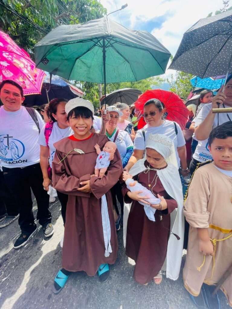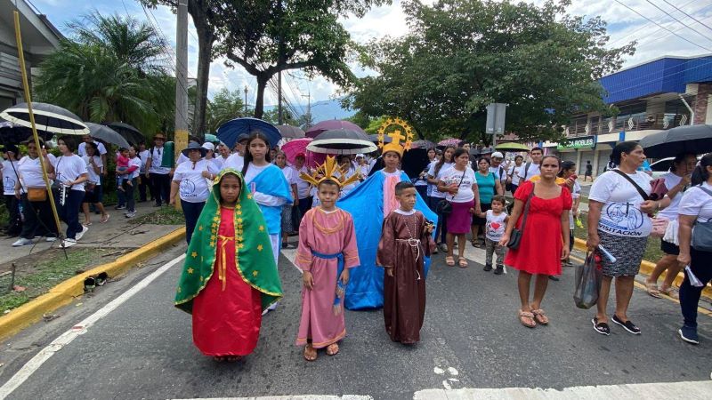 Los fieles peregrinaron en medio de alegres cánticos, portando vallas con el nombre de la parroquia y sus comunidades, acompañados de niños vestidos de sus santos patronos.