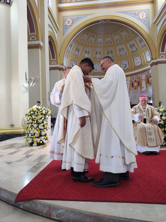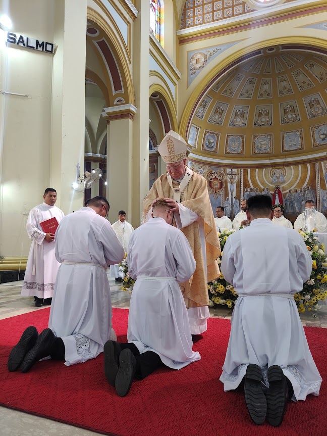 El rito continuó con un diálogo entre los ordenados diáconos, monseñor Miguel les impuso las manos y realizó la plegaria de ordenación, seguidamente se les impuso la estola y la dalmática y se les entregó el libro de los evangelios. El rito de ordenación presbiteral siguió con la imposición de manos y la plegaria ordenación de parte de nuestro obispo, luego, Marcos Irrael, fue revestido con la Estola y la Casulla sacerdotal, la unción de las manos con el santo Crisma, se hizo el rito del manutergio y se le entregó la Patena y el Cáliz.