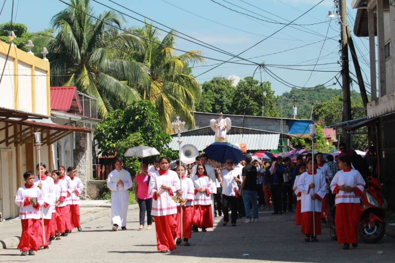 La fiesta inició con la procesión a las 9:30 a. m., la imagen de San Miguel Arcángel encabezó la caminata, seguida de los monaguillos, el párroco Miguel, el padre Dixie y los fieles de las comunidades parroquiales.
