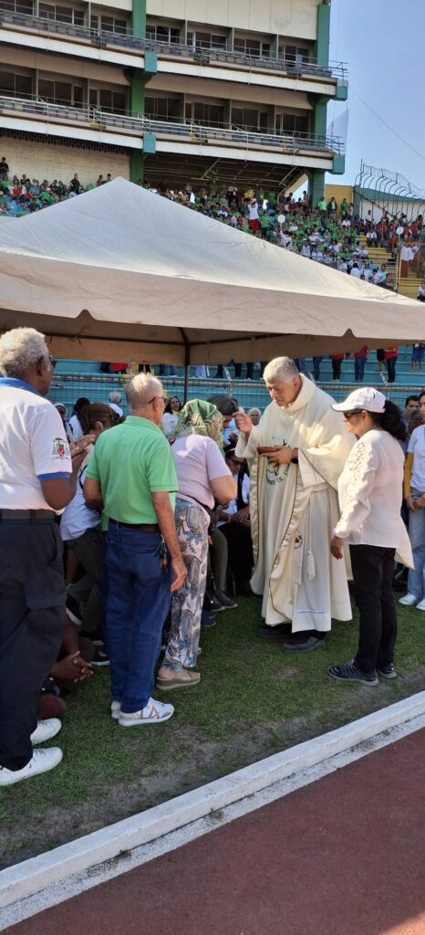 Muy significativo fue el momento de adoración eucarística cuando monseñor Miguel Lenihan recorrió la cancha con el Santísimo Sacramento, haciendo estaciones frente a cada zona. Posteriormente, todos en el estadio rezaron el Rosario Misionero para luego dar paso a la Santa Eucaristía oficiada por nuestro arzobispo Miguel y concelebrada por el clero arquidiocesano. Al finalizar la misa, monseñor Miguel hizo el envío a la Santa Misión 2026.